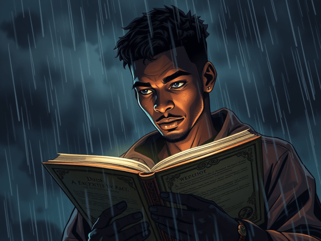 He lights the palm of his hand making a symbol that glows it, as he catches up to her, he slows his pace, walking beside her slowly. As wall of rain begins to come closer, visibly heavy as it pounds on the trail in front of them Dontai points his hand up and cast a barrier over them both. The clouds above overlap them, as the raindrops hit the barriers, it makes it pulsate a vibrant bluish-green. The large moon that was normally visible even in the day; was covered by the thick layered clouds, the wind blowing the trees every which way even causing some tree limbs to fall to fall and bounce off the barrier. “Wizard forecast said the weather would be bad but this is pretty horrific weather on the way to Amburst” she finally spoke, he said nothing, not to be rude but because he was deep into reading his grimoire. He was not paying much attention to the barrier, the rain, or anything really, from the intensity he was looking into the book she knew it had to be something important, at least more than usual.